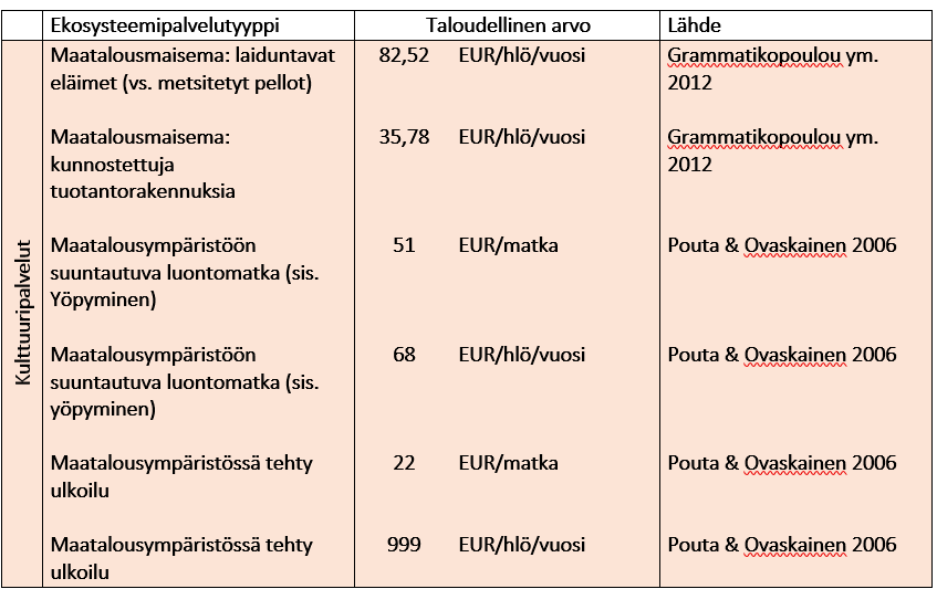 Maa- ja metsätalouteen liittyvien ekosysteemipalveluiden taloudellinen arvo Suomessa