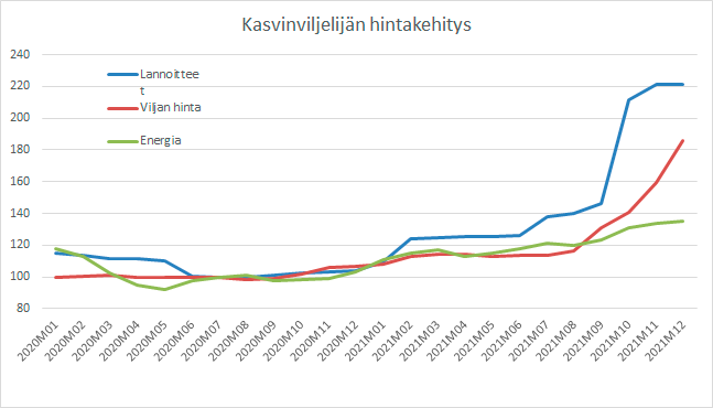 Tuotantopanosten hinnat ovat nousseet jo kohta kahden vuoden ajan. Lannoitteet ovat nyt yli tuplasti kalliimpia kuin kesällä 2020, energian hinta yli 30 % ja kotieläinten rehujen hinnat lähes 30 % kalliimpia tuohon ajankohtaan verrattuna.