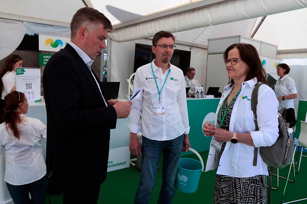Torstai ja kello löi kymmenen. Oikealta MTK:n puheenjohtaja Juha Marttila, MTK-Etelä-Savon toiminnanjohtaja Vesa Kallio ja MTK:n maaseudun elinvoimalinjan johtaja Päivi Nerg odottelevat väkeä osastolle.