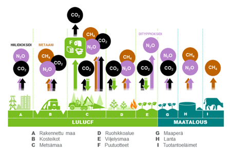 LULUCF (land-use, land-use change and forestry) on maankäytön, maankäytön muutoksen ja metsätaloussektorin (LULUCF) muodostama päästökokonaisuus. LULUCF-sektorilla maatalouden päästöjä ja poistumia raportoidaan kuudessa maankäyttöluokassa (metsämaa, viljelysmaa, ruohikkomaa, kosteikot, rakennettu maa ja muu maankäyttö) sekä puutuotteissa (katso alla oleva kuva). Hiilivaraston muutokset raportoidaan biomassalle, kuolleelle orgaaniselle aineelle ja maaperälle. Päästöjä raportoidaan typpilannoituksesta, ojituksesta (CH4, N2O) ja mukana ovat myös typen mineralisaatio sekä epäsuorat päästöt ja maastopalojen ja kulotusten päästöt (CO2, CH4, N2O). Taakanjako- ja LULUCF-sektorit mukaan lukien maatalouden osuus päästöistä on noin neljännes. Lue lisää Luken sivuilta.