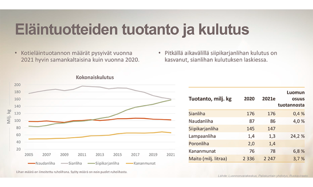 Kananmunantuotanto: Suomessa tuotettiin vuonna 2021 kananmunia hieman yli 77,5 miljoonaa kiloa. Suomalainen kananmunantuotanto on maailman huippua. Kanojemme nokkia ei typistetä, kananmunissa ei ole salmonellaa ja antibioottien käyttö on hyvin vähäistä. Antibiootteja käytetään vain sairauksien hoitoon, ei ennaltaehkäisevästi. Kuluttaja voi turvallisesti syödä kaikkia kotimaisia kananmunia vaikka raakana.