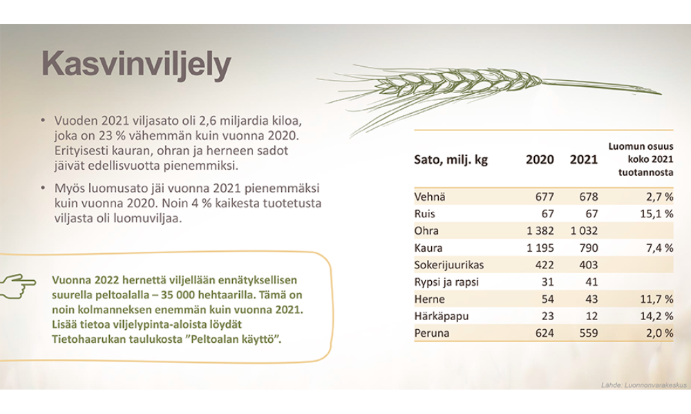 Kesä 2021 oli kasvuolosuhteiltaan poikkeuksellinen, mikä näkyi useimpien viljelykasvien poikkeuksellisen alhaisina hehtaari- ja kokonaissatoina. Alla olevaan taulukkoon on koottu keskeisimpien elintarvike- ja rehukäyttöön menevien kasvien kokonaissatoja vuodelta 2021.