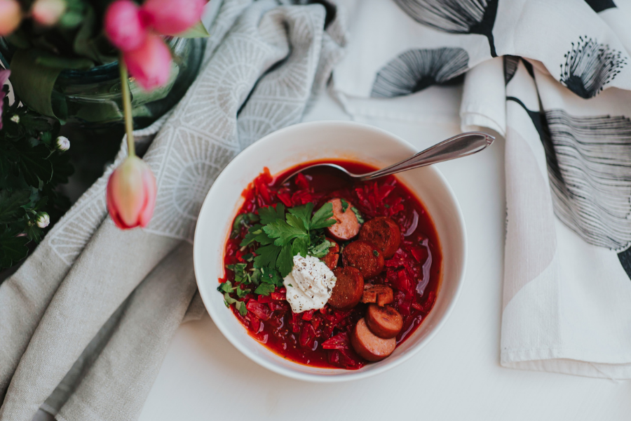 Houkuttelevan punainen borssikeitto on talviruokien kuninkaallinen! Borssi on helppoa valmistaa, se on hyvää uudelleen lämmitettynä, valmista kerralla siis reilu annos keittoa. Edulliset, kotimaiset varastojuurekset muhivat maukkaaksi kokonaisuudeksi, jota on helppo varioida. Perinteiseen borssikeittoon sopii sattumiksi täyteläinen ja pitkään haudutettu naudan lapa kuutioina, uutta makua borssi saa mausteisesta makkarasta. Annos kruunataan nokareella täyteläistä smetanaa tai ranskankermaa.
