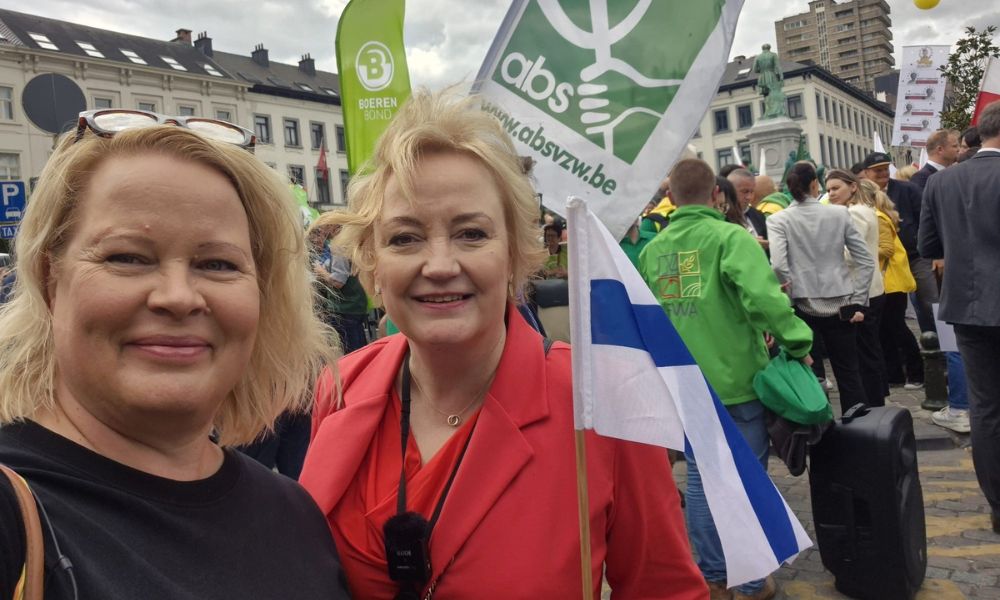 MTK:n Brysselin toimiston johtaja Hanna Leiponen-Syyrakki ja suomalaismeppi Elsi Katainen osallistuivat mielenilmaukseen.