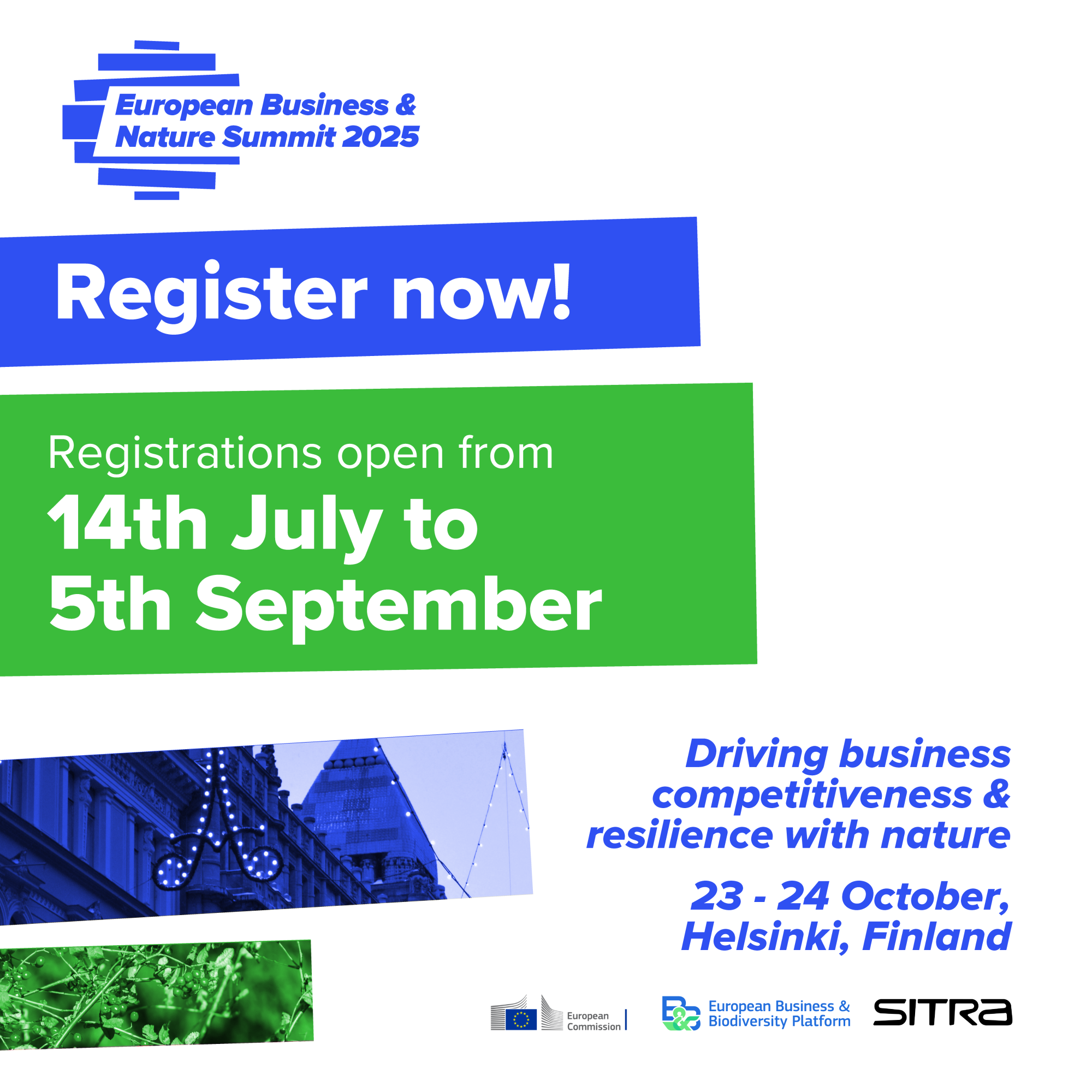 European Business & Nature Summit 2025:ssä järjestetään Finlandia-talolla, Helsingissä 23.–24. lokakuuta 2025. Kyseessä on ensimmäinen kerta, kun huipputapahtuma pidetään Pohjoismaissa.
