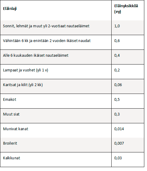 Eläinmäärät muutetaan eläinyksiköiksi taulukon kertoimien mukaisesti
