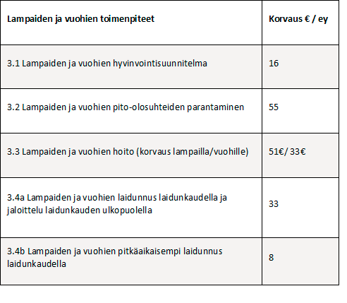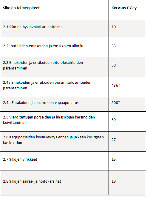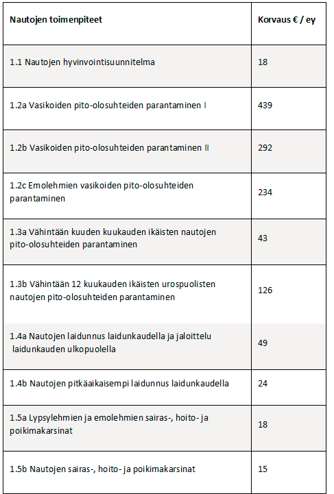 Eläinten hyvinvointikorvauksen määrä (€/ey) perustuu toimenpiteen tilalle aiheuttamiin laskennallisiin kustannuksiin tai tulonmenetyksiin. Korvausmäärät on esitetty taulukoissa 2a, 2b, 2c ja 2d.