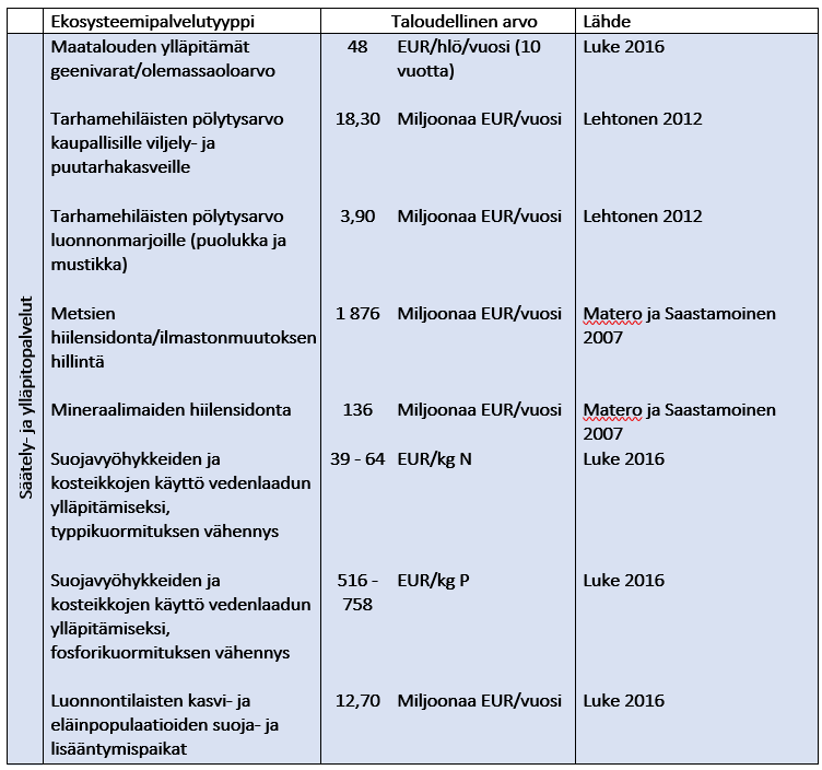 Vuonna 2015 valmistunut Suomen TEEB-hanke (The Economics of Ecosystems and Biodiversity), on osa kansainvälistä aloitetta, jonka tavoitteena on tehdä ekosysteemipalvelut näkyväksi ja osaksi päätöksentekoa. Eräänlaisena jatkohankkeena Maa- ja metsätalousministeriön rahoittama MAAESP-hanke selvittää maatalouspolitiikan vaikutuksia markkinattomiin ekosysteemipalveluihin, koettuun hyötyyn ja hyödyn taloudelliseen arvoon. Hankkeen tulokset valmistuvat vuonna 2018. (Luke MAAESP.)