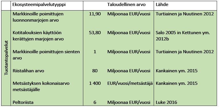 - Ahtiainen, H., Artell, J., Pouta, E. & Lankia, T. 2015. Valuation of ecosystem services in Jäppinen, J.-P. & Heliölä, J. (eds.) 2015: Towards a sustainable and genuinely green economy. The value and social significance of ecosystem services in Finland (TEEB for Finland). Synthesis and roadmap. The Finnish Environment 1en/2015. The Finnish Ministry of Environment, Helsinki. s. 22
