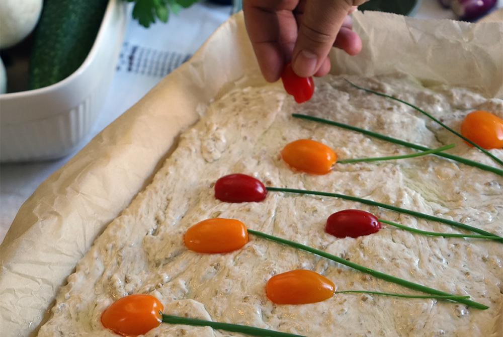 Halutessasi voit koristella taikinan ”kukkapelloksi”. Tee ruohosipulista kukille varret, puolitetuista tomaateista, ja sipulirenkaista saat taiteiltua hienoja kukkia ja yrteistä lehtiä! Ripottele leivän päälle vielä halutessasi muutama kide sormisuolaa.