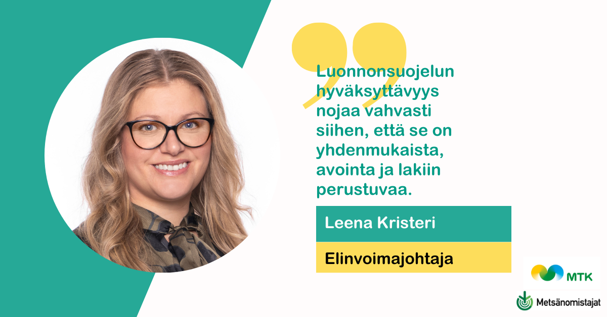 Suomessa on totuttu siihen, että luonnonsuojelu tapahtuu lainsäädännön ja sopimusten kautta. Tähän kuuluu selkeä prosessi: viranomaiset tekevät perusteltuja ja valituskelpoisia päätöksiä ja maanomistajille maksetaan korvaukset. Toiminta perustuu avoimuuteen ja vapaaehtoisuuteen aina, kun mahdollista, ja lainsäädäntöön silloin, kun se on välttämätöntä, pohtii elinvoimajohtaja Leena Kristeri MTK:n blogissa.