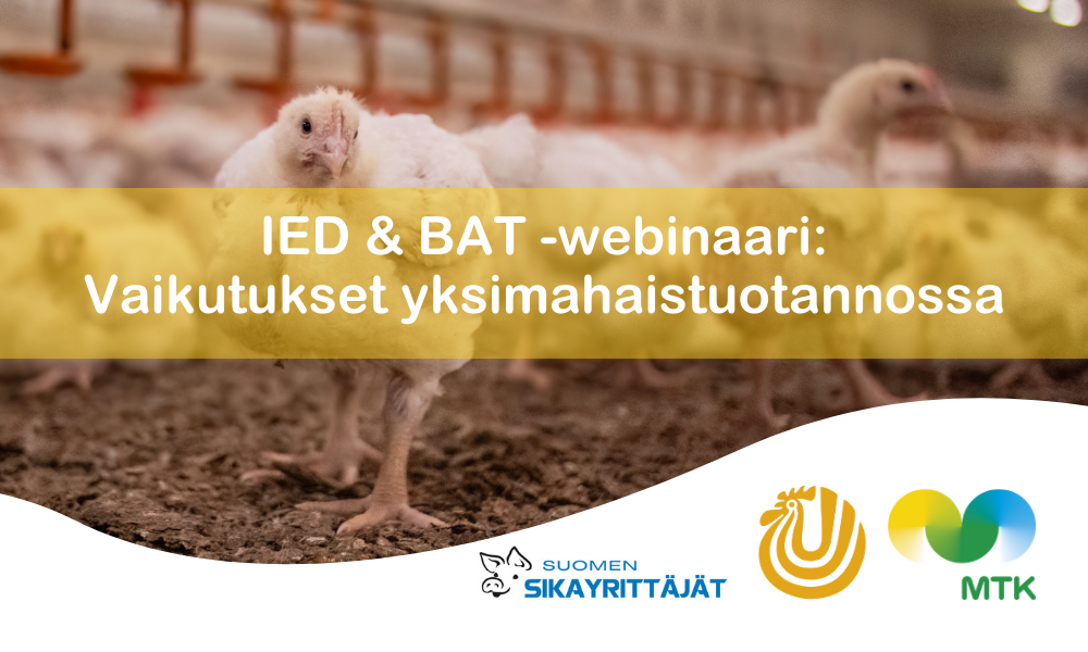 Suomen Siipikarjaliitto, Suomen Sikayrittäjät ja MTK järjestävät yhteistyössä webinaarin ajankohtaisista IED- ja BAT- asioista. Mikä muuttuu direktiivien myötä ja miten ne vaikuttavat alan tuottajiin? Siipikarjan ja sika-alan tuottajille suunnatussa webinaarissa kuulet, mitä tuottajan tulisi muutoksista tietää. Tervetuloa linjoille!
