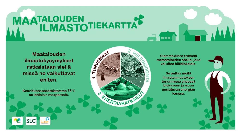 Maatalous on olennaisessa roolissa Suomen asettaman kunnianhimoisen hiilineutraaliustavoitteen saavuttamisessa. Tätä varten olemme teettäneet Luonnonvarakeskuksella (Luke) ilmastotiekartan, joka tutkii, minkälaisin askelin, harppauksin ja pelimerkein voimme tuota tavoitetta kohti astella. Maatalouden ilmastotiekartta on keskustelunavaus ja osa työ- ja elinkeinoministeriö TEM:n ilmastotiekarttojen toimeksiantoa laatia Suomen ilmastotavoitteita tukevia vähäpäästöistä kehitystä kuvaavia vähähiilitiekarttoja vuoteen 2050. Ilmastotiekartan mukaan Suomen maataloudelle kasvihuonekaasuneutraalius on lähes mahdoton tavoite nykyisillä päästökertoimilla ja hiilensidonnan laskennalla. Tästä huolimatta maatalouden tulisi pyrkiä päästöjen vähentämiseen siinä mitassa, joka on mahdollista ruokaturvaa heikentämättä, maataloustuottajille kohtuullista ja kestävän kehityksen mukaista omat vahvuudet tunnistaen. Tiekartan pääkohdat on esitelty alla. Linkit raporttiin ja muihin aineistoihin löytyvät tämän artikkelin lopusta.