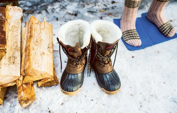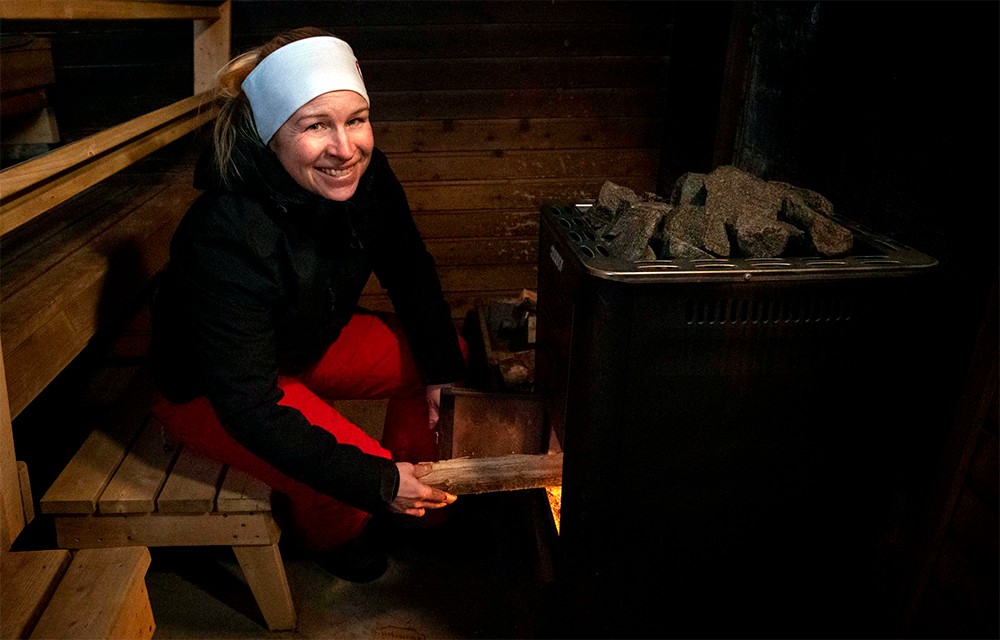 Jenni Numminen saunanlämmityspuuhissa. Kuva: Anne Kalliola.