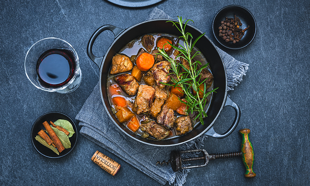 Ota lihat huoneenlämpöön noin tunti ennen paistamista. Paloittele liha reiluiksi kuutioiksi. Kuori ja lohko sipulit ja hienonna valkosipulinkynnet. Kuori ja paloittele porkkanat, palsternakka ja lanttu. Kuumenna voi paistinpannulla ja ruskista lihat parissa erässä. Kaada ne uunipataan. Ruskista sipulit ja juurekset. Lisää pataan. Lisää mausteet, suola ja rosmariini. Kaada päälle lihalientä niin, että ainekset peittyvät. Hauduta 150 asteessa 3-4 tuntia muutaman kerran käännellen.