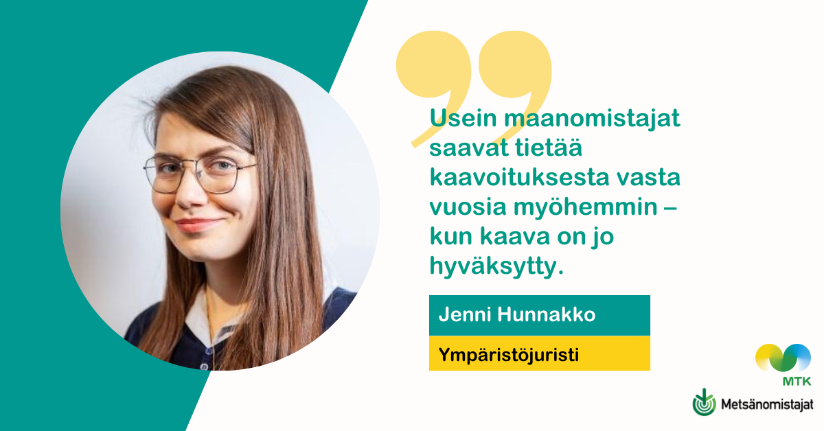 MTK:ssa Pirkkalan tapaus ei ole poikkeus. Usein maanomistajat saavat tietää kaavoituksesta vasta vuosia myöhemmin – kun kaava on jo hyväksytty. Syynä on alueidenkäyttölaki, joka ei vaadi suoraa tiedottamista. Riittävä tiedotus tarkoittaa, että tieto on kunnan verkkosivuilla. Siellä se on – jos osaa etsiä.