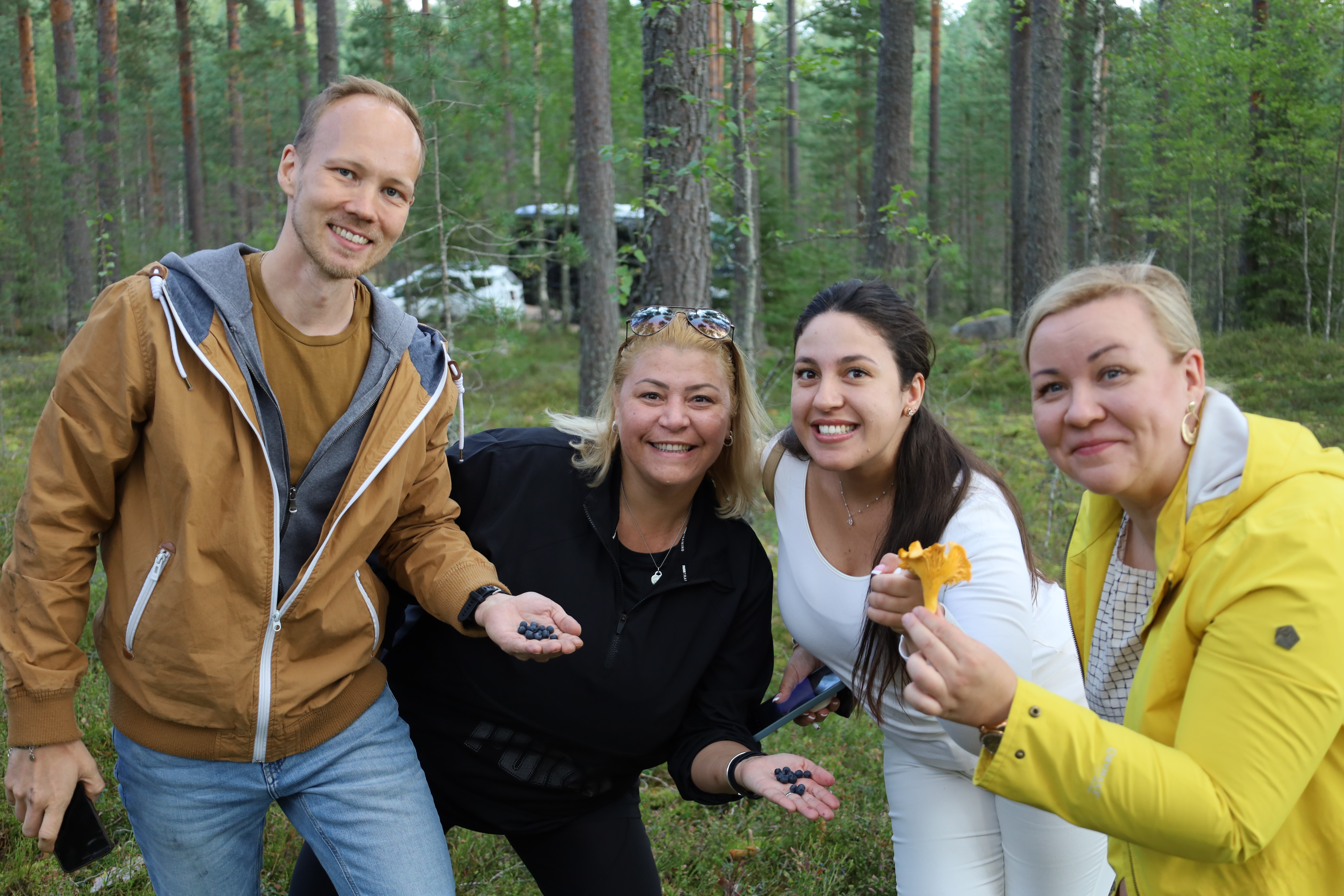 Päivän odotuksista keskusteltaessa vieraiden toive oli viettää aikaa ulkona, ja maistaa marjoja sekä sieniä. Muutamia kanttarelleja, puolukoita ja myöhäisiä mustikoita löytyikin Salon kuivilta kankailta. Suomalainen metsä, jossa jokainen saa kävellä vapaasti, ja poimia luonnonmarjoja tai sieniä, oli monelle vieraalle ainutkertainen elämys. Hiljaisuus ja auringon lämmittämän syksyisen metsän raikas tuoksu kutsuivat rauhoittumaan, vaikka jo Helsinki oli monelle suurkaupungin kasvatille tuntunut rentouttavalta.