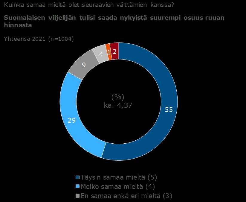 Suomalaisista 84 % on täysin tai melko samaa mieltä siitä, että viljelijöiden tulisi saada nykyistä suurempi osuus ruuan hinnasta. Neljä viidestä suomalaisesta ilmoittaa olevansa valmis maksamaan ruuastaan enemmän, mikäli hinnankorotus kanavoituisi kokonaan viljelijälle. Enemmistö näin vastanneista olisi valmis korottamaan kotimaisen ruuan hintaa muutaman prosentin ja viidenneksen väliltä.
