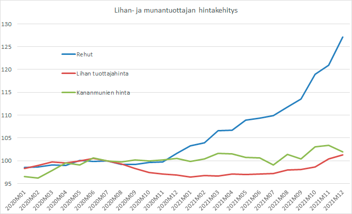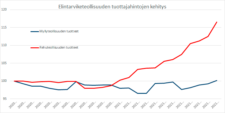 Kotieläintuotteiden tuottajahinnat ovat sen sijaan polkeneet paikallaan tämän ajan. Elintarviketeollisuus ei ole kaupan puristuksessa onnistunut viemään kustannusnousuja omiin myyntihintoihinsa päivittäistavarakaupalle. Kaikkein selvimmin tämä näkyy siinä, kun katsotaan teollisuuden tuottajahintakehitystä ja verrataan myllyteollisuuden hintakehitystä rehuteollisuuden hintoihin. Rehujen hintoihin raaka-aineen hinnan nousu on onnistuttu siirtämään, mutta ei myllyteollisuuden tuotteisiin. Teollisuudella näyttää olevan selvästi enemmän markkinavoimaa suhteessa rehun myyjiin kuin vähittäiskauppoihin.