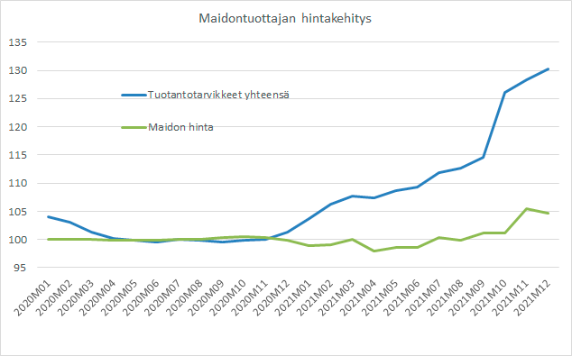 Tuotantopanosten hinnat ovat nousseet jo kohta kahden vuoden ajan. Lannoitteet ovat nyt yli tuplasti kalliimpia kuin kesällä 2020, energian hinta yli 30 % ja kotieläinten rehujen hinnat lähes 30 % kalliimpia tuohon ajankohtaan verrattuna.