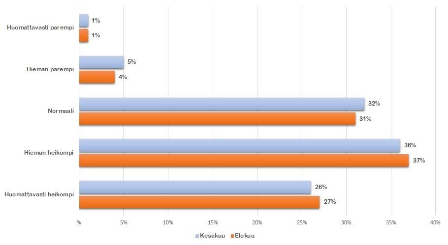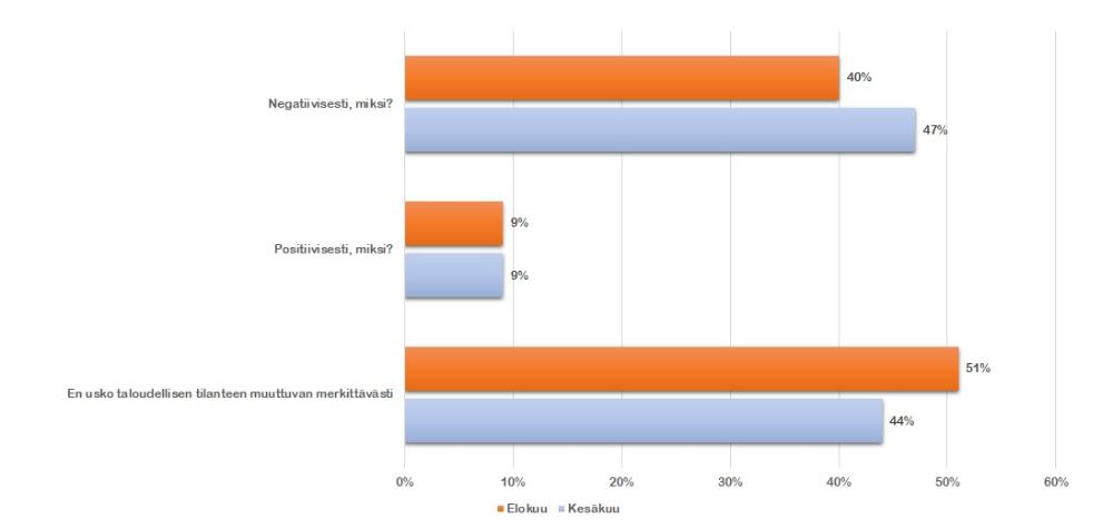 Kuva 2 Miten arvioisit taloudellisen tilanteen kehittyvän seuraavan 12 kuukauden aikana? (vertailu kesä- ja elokuu) Puolet vastaajista ei koe taloudellisen tilanteen muuttuvan merkittävästi. On huomioitava, että monella taloudellinen tilanne on jo valmiiksi heikko, kuten kuvasta 1 voidaan nähdä. Todella moni kokee myös tilanteen taloudellisen tilan heikentyvän eli seuraavan vuoden aikana voi heikkoon taloudelliseen tilanteeseen ajautua yhä useampi maatila. Heikkenemisen takana on edelleen korkeat tuotantopanoshinnat.