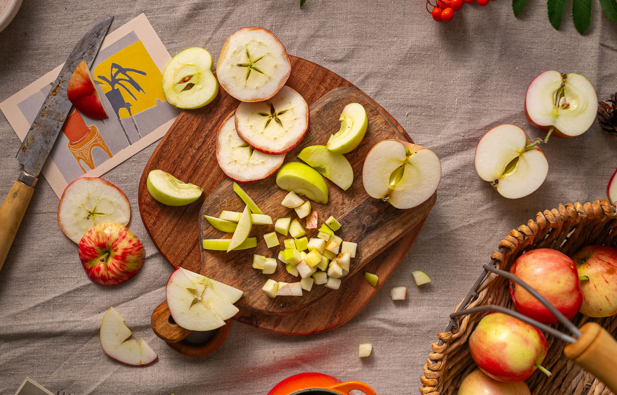 Huuhtele omena, halkaise ne ja poista siemenet. Viipaloi omenat reilun suupalan kokoisiksi viipaleiksi.
