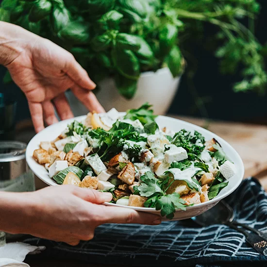 - Leikkaa kaali ohuiksi suikaleiksi, revi tai leikkaa salaatit suupaloiksi. Kuutioi kurkku ja tomaatti. Kokoa salaatti nostelemalla salaattipohjalle kurkkua, tomaattia, paahdettuja ja marinoituja vihanneksia, juustokuutioita ja krutonkeja sekä halutessasi kypsää kalaa. Viimeistele tuoreilla yrteillä tai kesäsipulin varsilla. Tarjoa lisänä ranch-kastiketta.