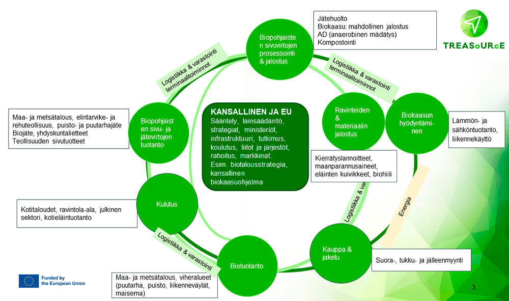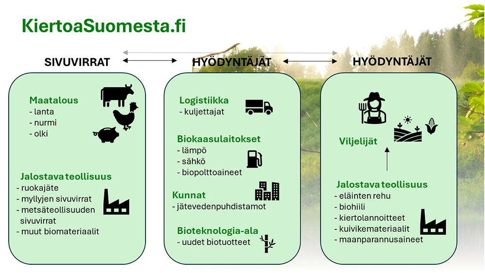 Maatalouden biopohjaisten sivuvirtojen - kuten lannan, olkien ja nurmibiomassan - hyödyntämisessä on vielä paljon parantamisen varaa. Nämä materiaalit ovat hyviä raaka-aineita biokaasulaitoksille ja erilaisille biojalostamoille. Myös jätteitä, kuten yhdyskuntien biojätettä tai jätevedenpuhdistamoiden puhdistamolietettä, voidaan käyttää osana biopohjaista järjestelmää. Virroista voidaan tuottaa energiaa ja uusia tuotteita, jotka voivat tuoda merkittävää lisäarvoa. Fossiilisia polttoaineita voidaan puolestaan käyttää vähemmän, mikä vähentää ympäristövaikutuksia.