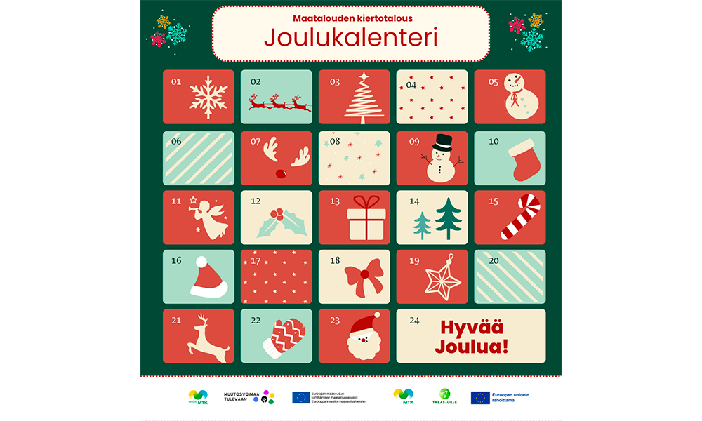 Joulukuu on täällä ja tuo mukanaan odotetun maatalouden kiertotalouskalenterin! Jouluun saakka jokaisena päivänä luukusta avautuu uusia vinkkejä ja konkreettisia esimerkkejä siitä, miten kiertotaloutta voidaan edistää tiloilla. Kalenterin tavoitteena on tehdä kiertotalous näkyväksi arjessa ja antaa tunnustusta tiloille tärkeästä työstään kestävän kehityksen hyväksi.