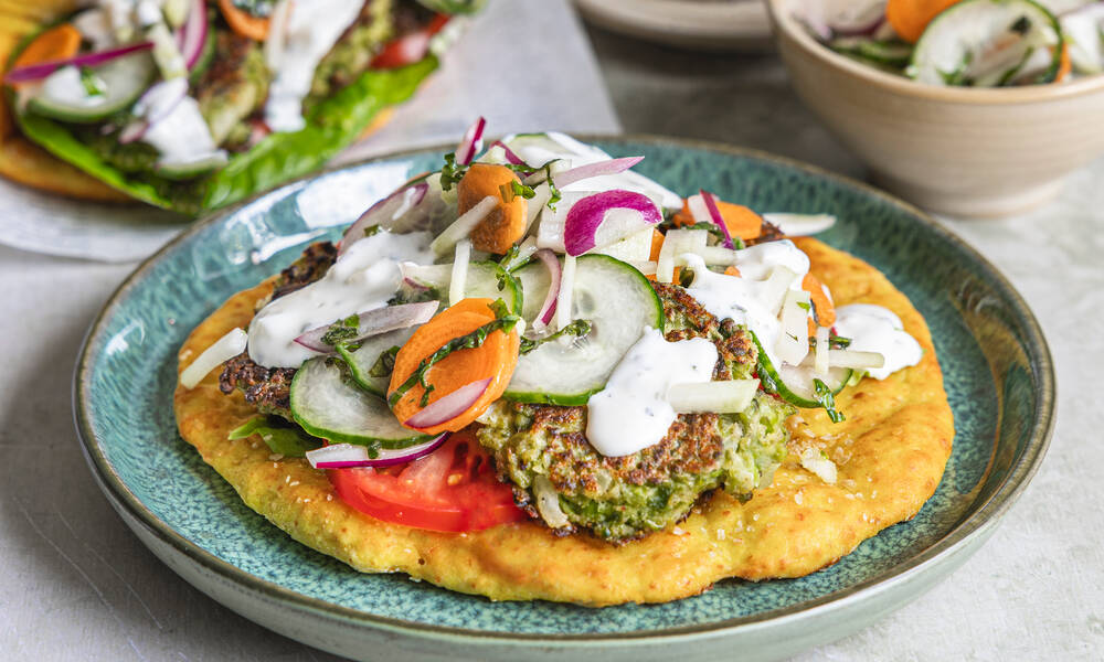 Sekoita jauhot, leseet, leivinjauhe, kurkuma ja suola keskenään. Lisää jogurtti. Vaivaa taikina tasaiseksi. Jaa taikina 4 osaan ja pyörittele jauhojen avulla palloiksi. Taputtele pallot ohuiksi kiekoiksi (halk.15 cm) leivinpaperin päälle pellille. Sivele leivät rypsiöljyllä, ripottele kauraleseitä pintaan ja paista 8–10 minuuttia uunin keskitasolla. Täytä pitaleivät salaatilla, tomaatilla ja hernepihveillä sekä marinoiduilla kasviksilla ja valkosipulikastikkeella.