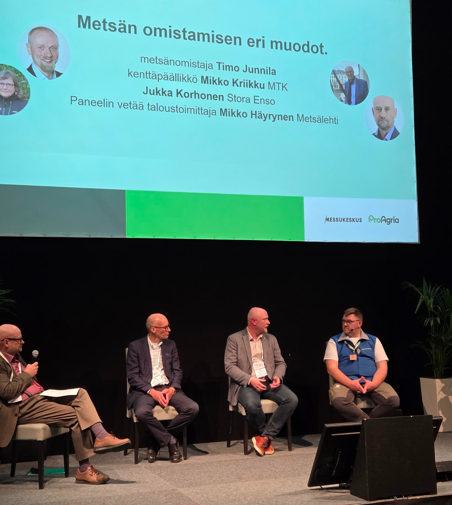 Mielenkiintoiseen keskusteluun osallistui perjantaina myös MTK:n Pirkanmaan kenttäpäällikkö Mikko Kriikku. Keskustelemassa olivat lisäksi metsänomistaja Timo Junnila sekä neuvonta-asiantuntija Jukka Korhonen Stora Ensolta. Paneelin vetäjänä toimi Metsälehden taloustoimittaja Mikko Häyrynen.
