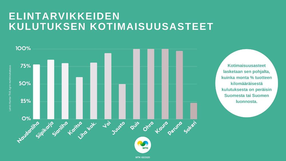 Luonnonvarakeskuksen tuoreimman selvityksen mukaan elintarvikemarkkinoiden kotimaisuusaste oli Suomessa vuonna 2012 yli 70 prosenttia. Peruselintarvikkeissa omavaraisuus on korkea. Korkeimmillaan omavaraisuus on kananmunissa, maidossa, siipikarjanlihassa, sianlihassa, naudanlihassa ja leipäviljassa.