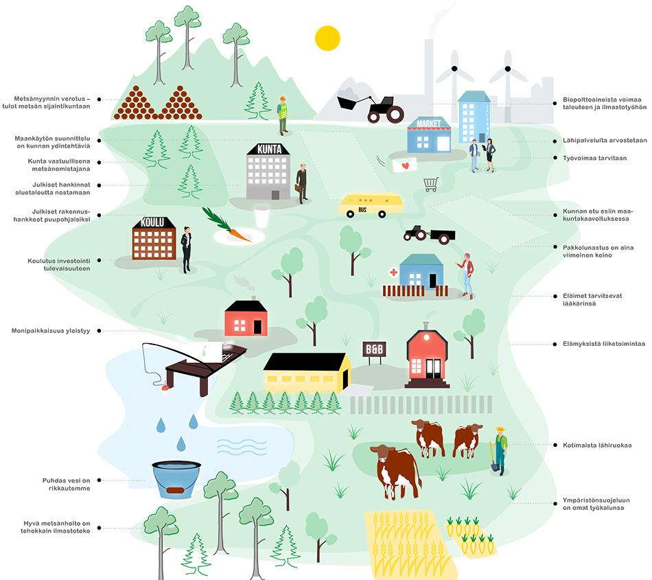 MTK:n kuntavaaliohjelma muistuttaa, että maa- ja metsätalous tuovat elinvoimaa ja rahavirtoja kuntiin. Elinvoimaisen maaseudun pitää olla myös jokaisen kaupungin tavoitteena. Ilman elinvoimaista maaseutua ei kaupungeilla ole mahdollisuuksia kestävään ruoka- tai energiahuoltoon. Yhtälailla puhdas vesi ja rakennusmateriaalit edellyttävät kaupunkien ja maaseutujen kehittämistä.