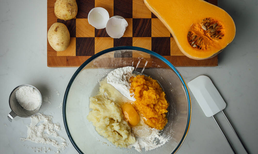 - Kuori myskikurpitsa ja poista sen siemenet. Kuori perunat. Keitä kurpitsa ja perunat erillisillä kattiloissa kypsiksi ja soseuta hienoksi soseeksi. Anna jäähtyä.