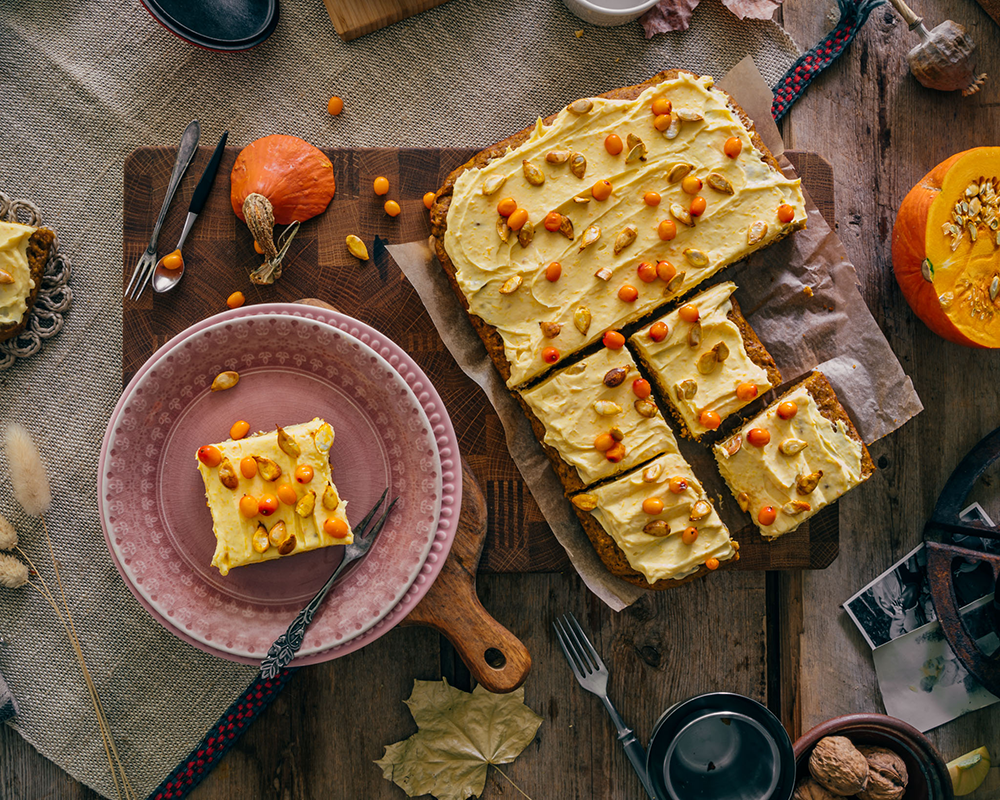 Kurpitsa tuo mukavaa maanläheistä makeutta kakkuun ja antaa sille mehevän suutuntuman. Lämpimät mausteet, eli kaneli, inkivääri ja neilikka, tuovat makuun monivivahteisuutta ja täyteläisyyttä. Kokonaisuuden raikastaa päälle ripoteltavat kirpsakat tyrnimarjat.
