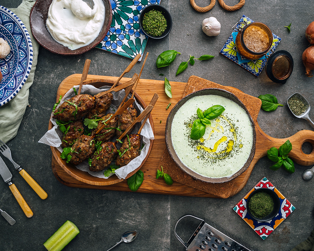 Yrttiset lammaskebakot ja kurkku-basilikakastike
