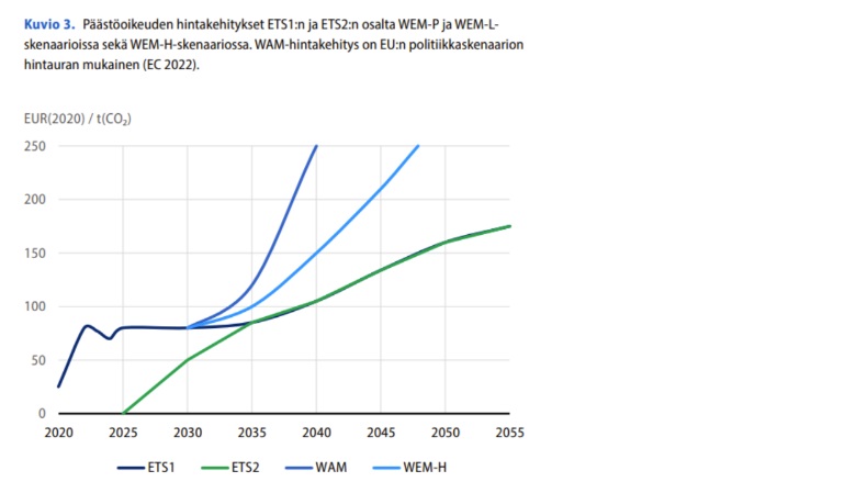 Kuva 1. Päästöoikeuden hintakehitys. ETS2 kuvaa arviota fossiilisten polttoaineiden jakelun päästöoikeuden hintakehityksestä.