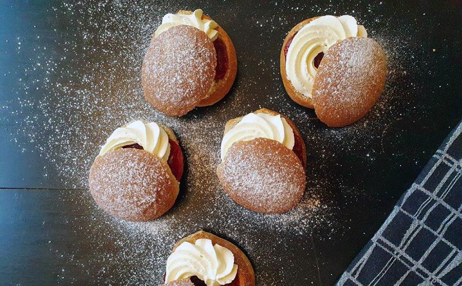 • Leikkaa jäähtyneistä pullista lakki pois, ja täytä hillolla, marjasurvoksella tai mantelimassalla ja kermavaahdolla.