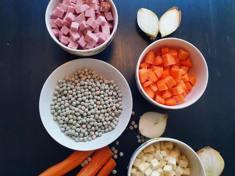• Valmistele sattumat: kuutioi palvikinkku tai kasviskeittoon kuori ja kuutio sipuli, porkkana ja palsternakka.
