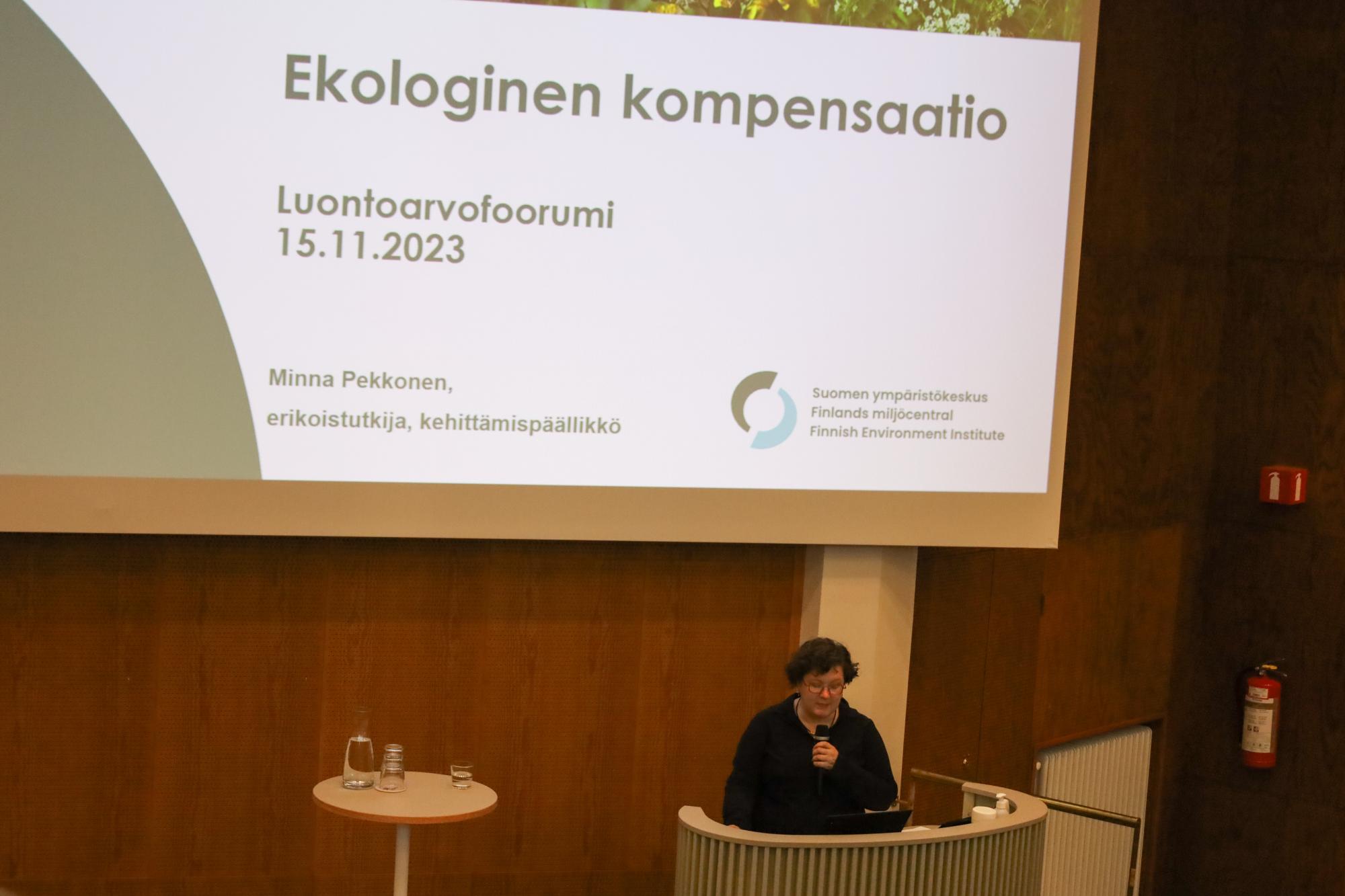 Luontoarvofoorumissa ekologiseen kompensaatioon keskittyi erityisesti puheenvuorossaan Syken Minna Pekkonen. Toimivat ja laajalti hyväksytyt mittaristot ja luontoarvojen arviointimenetelmät ovatkin erityisesti hankkeen keskiössä.