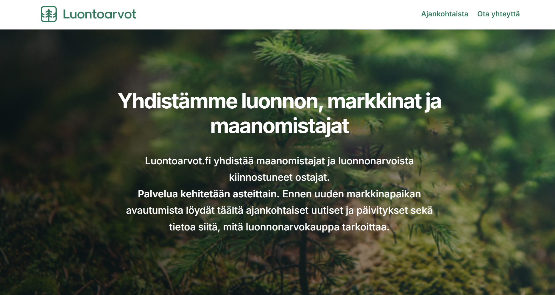 Vastaavasti luontoarvoista kiinnostuneet henkilöt, yritykset ja muut toimijat voivat julkaista hankintailmoituksia tai ostotarjouksia haluamistaan luontokohteista, rakennepiirteistä tai vaikkapa ennallistamistoimista. Palvelua kehitetään parhaillaan ja sivuston uudistetut ominaisuudet on tarkoitus julkaista maaliskuussa 2026.