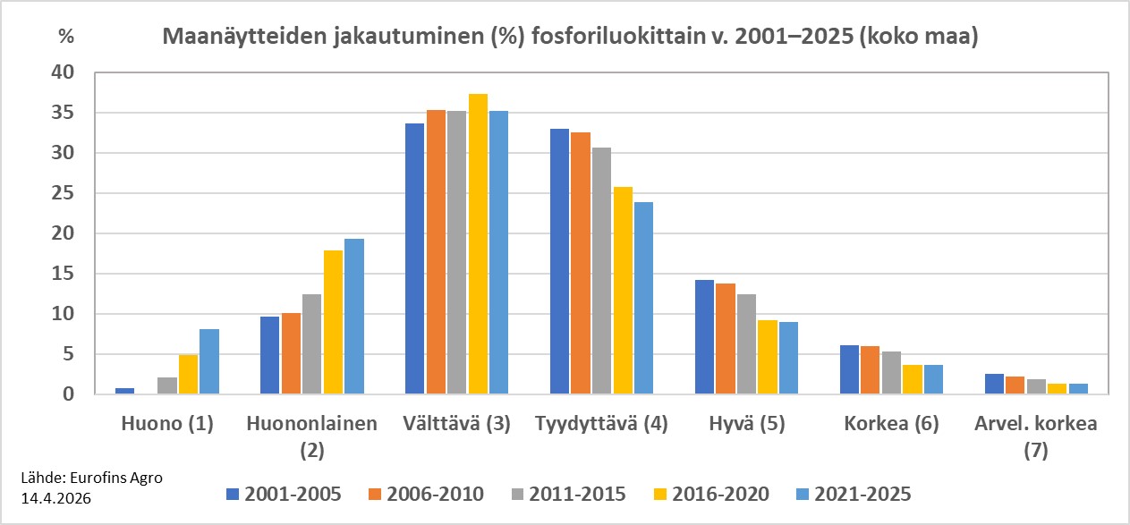 Luke on koonnut viljavuustietoja viljavuusanalyysejä tekeviltä laboratorioilta neljältä ajanjaksolta: 1996–2000, 2005–2009, 2010–2014 ja 2015–2019 (Lemola ym. 2023). Korkeiden P-lukujen osuus on vähentynyt selvästi ajan kuluessa. Koko maan pelloista 3 korkeimman P-luokan osuus oli ensimmäisellä jaksolla noin 28 % ja viimeisenä jaksona 17 %. Keskimmäisten luokkien osuus on koko maan tasolla pysynyt tasaisesti 64–65 %:ssa maanäytteistä kaikilla jaksoilla. Kahden alimman luokan osuus on kasvanut ensimmäisen jakson 7 %:sta neljännen jakson noin 19 %:iin. Peltomaiden keskimääräinen P-pitoisuus on laskenut 20 vuodessa aikana 26 % (v. 1996–2000 keskim. 14,5 mg/l ja v. 2015–2019 keskim. 10,7 mg/l).