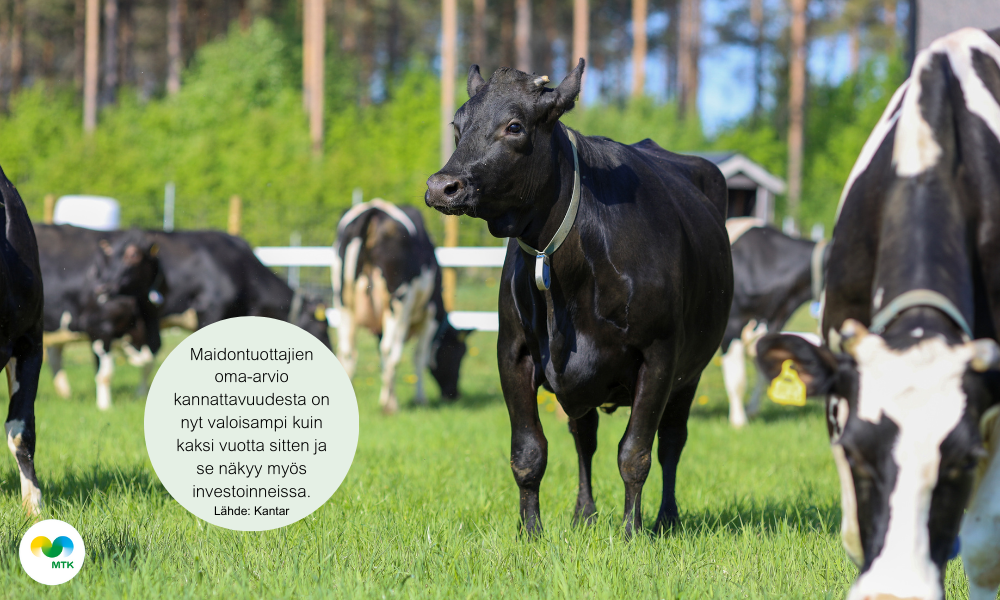 Maidontuottajien oma-arvio kannattavuudesta on nyt valoisampi kuin kaksi vuotta sitten. Erittäin tai melko hyvänä kannattavuutta piti 27 % tiloista ja 37 % tyydyttävänä. Investointeja maidontuotantoon on nyt suunnitteilla hieman enemmän kuin viime tai toissa vuonna. Laajennuksia on nyt rakenteilla enemmän ja investointiajatukset ovat varmempia. Investointituen merkitys korostuu edelleen, sillä vain viisi prosenttia sanoo toteuttavansa investoinnin, vaikka ei saisikaan tukea.