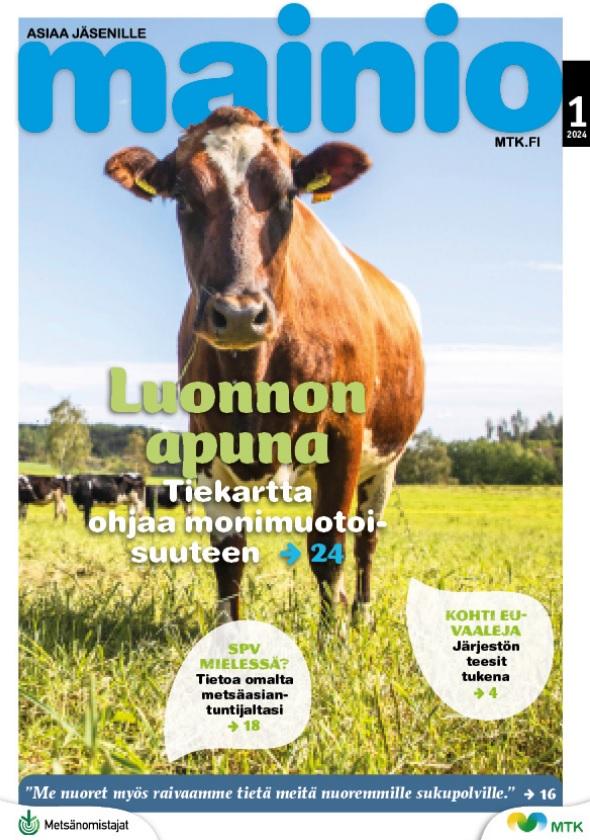 MTK:n jäsenlehti Mainion kevään 2024 numero on ilmestynyt. Lehti jaetaan postitse kaikkiin metsänhoitoyhdistysten ja MTK-yhdistysten jäsentalouksiin 27.3 mennessä.