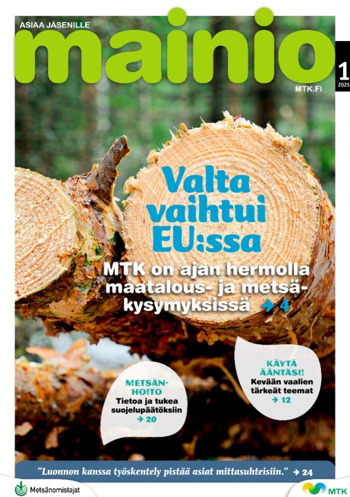 Mainio-jäsenlehti on ilmestynyt. Se jaetaan postitse kaikkiin MTK-yhdistysten ja metsänhoitoyhdistyksen jäsentalouksiin viimeistään 27.3. Lehti on julkaistu ennakkoon MTK:n mobiilisovelluksessa.