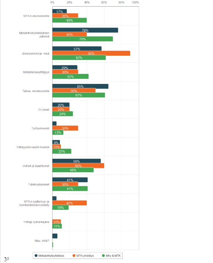 Kyselyssä selvitettiin jäsenten toiveita ja tarpeita lehden sisällön suhteen. Jäsenpalvelut ja edut, metsänhoitoyhdistyksen palvelut sekä vero- ja talousneuvot kiinnostavat eritoten. Myös ajankohtaisia uutisia ja tapahtumista kertomista arvostetaan.