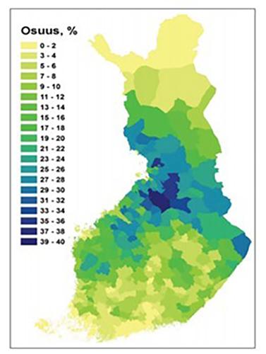 Ojitettujen soiden osuus maapinta-alasta (Laiho ym. 2016).