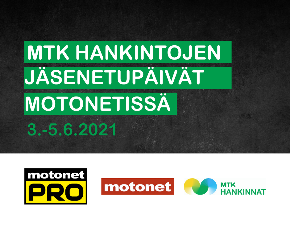 Motonet ja MTK Hankinnat kutsuvat MTK- ja mhy-jäsenet jäsenetupäiville 3.-5.6.2021 kaikkiin Motonet-tavarataloihin. Päivien aikana jäsenet saavat huomattavan alennuksen kaikista normaalihintaisista tuotteista. Koskee kaikkia jäseniä – oli Motonetin tili avattuna tai ei. Tavaratalon kassalla tulee näyttää voimassa olevaa jäsenetukorttia.