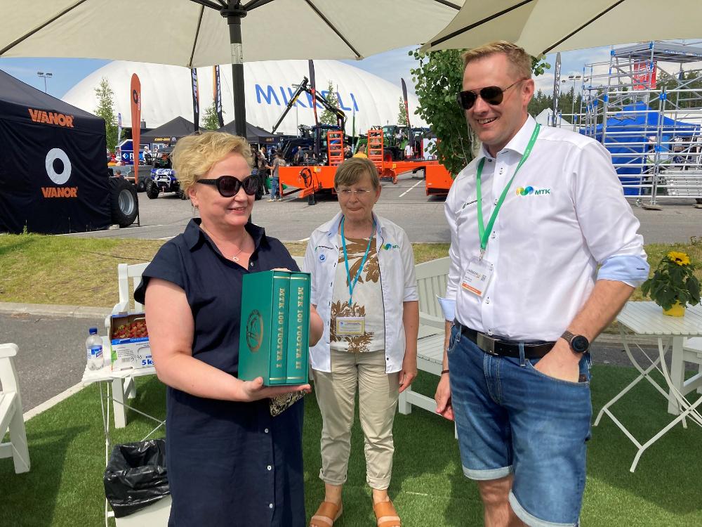 Lauantai oli Farmari-päivistä vilkkain yleisömäärältään. Lauantaina osastollamme vieraili myös MEP Elsi Katainen, joka vastaanotti MTK:n historiateoksen järjestöpäällikkö Matti Rehulalta.
