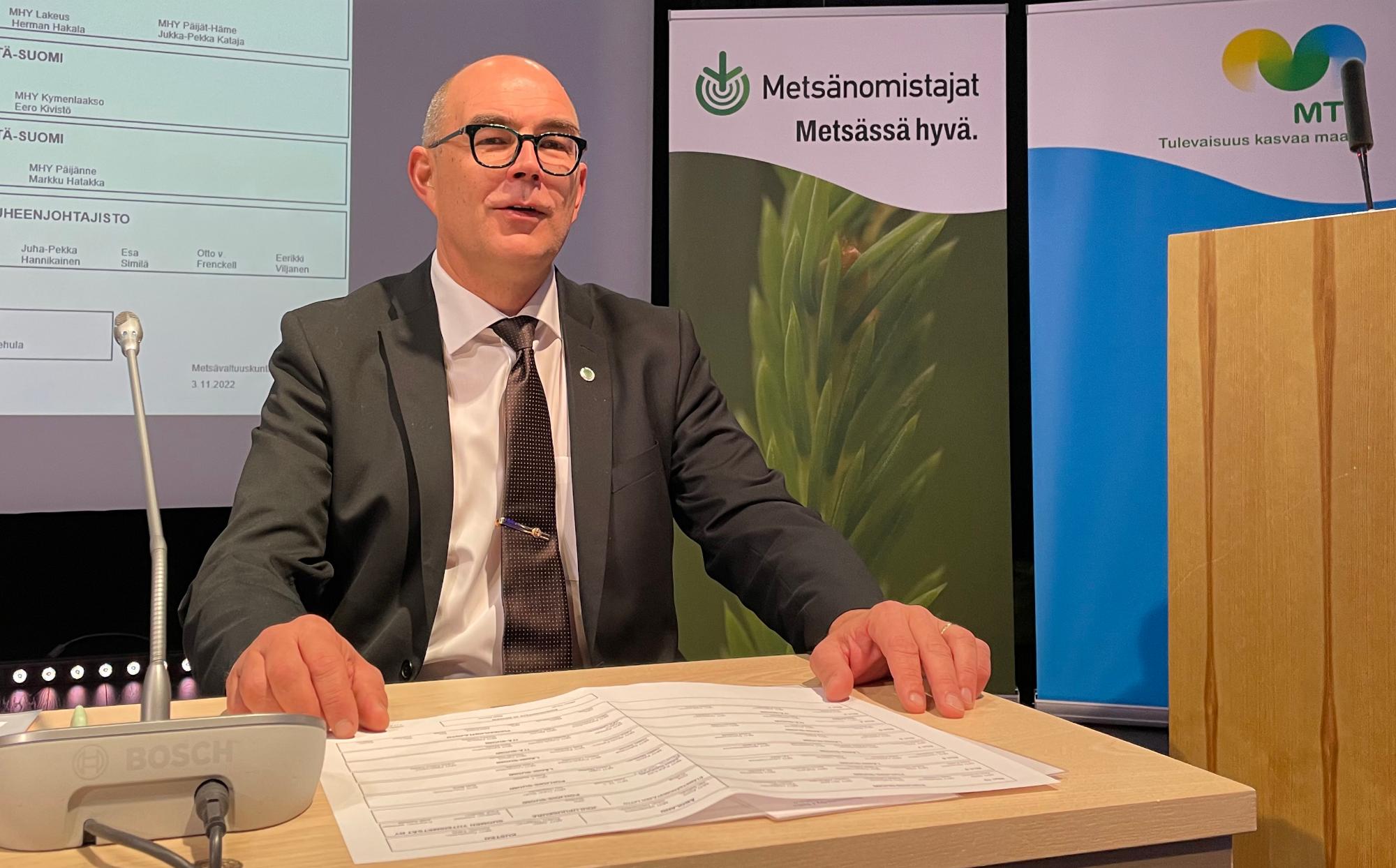 MTK:n metsävaltuuskunnan puheenjohtaja Mikko Tiirola korosti puheessaan maanomistajan omaisuudensuojaan liittyviä ongelmia. - 45 vuotta vanhaa lunastuslakia ei tämäkään hallitus saanut uudistettua. Epäoikeudenmukaisuus joka sähkönsiirtolinjoista ja niiden kelvottomista lunastuskorvauksista aiheutuu, uhkaa sinänsä tarpeellisen vihreän siirtymän hyväksyttävyyttä, Tiirola harmittelee. - Haluan antaa tässä vahvan viestin vaaleja odotteleville eduskuntaryhmille: Ottakaa nyt tosissanne se, että lunastustilanteissa maapohjalle määritettäisiin jatkossa vähimmäiskorvaustasoksi edes verottajan määrittämä arvo.